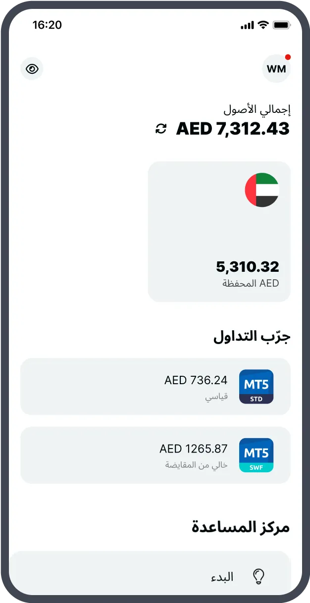 كن على اتصال بالأسواق العالمية أينما كنت. قم بإدارة حسابك، وأكمل عمليات الإيداع والسحب، وابدأ التداول على MT5 متى احتجت، كل ذلك من مكان واحد.