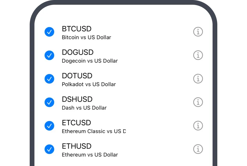 Access top digital currencies including Bitcoin, Ethereum, Solana, and more.
